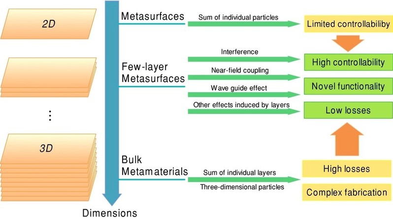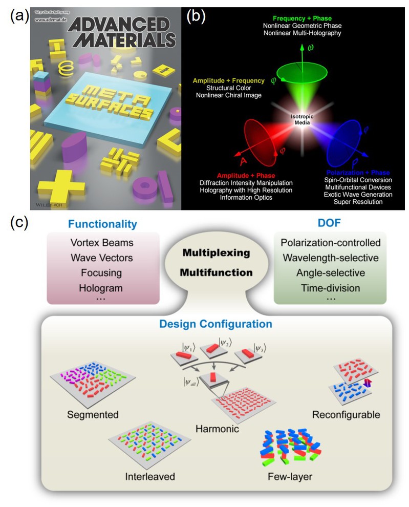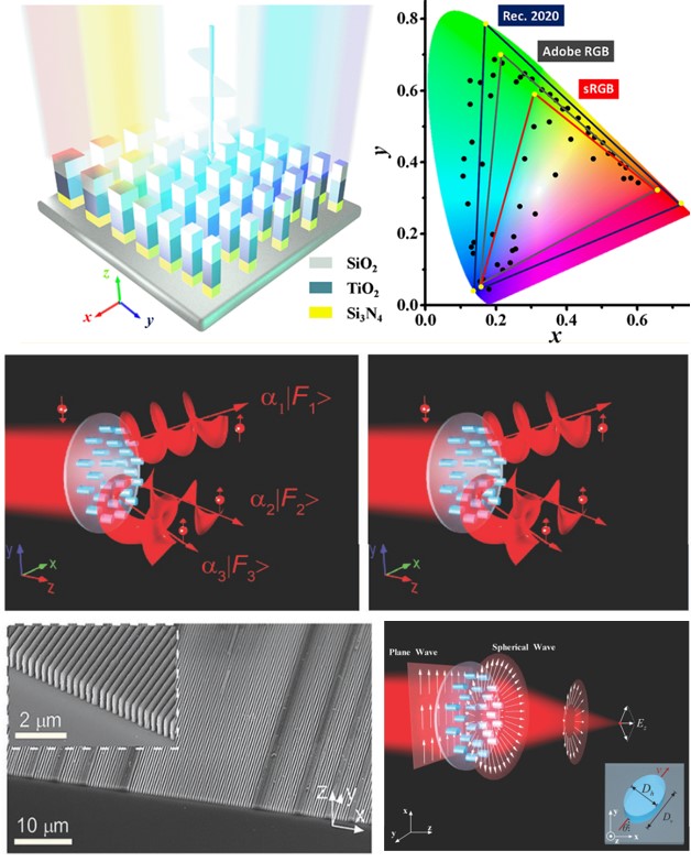图3. 少层人工微结构光场调控具有丰富物理效应、高调控自由度、 3. 电介质微结构光场调控超材料自诞生之际,其低下的效率与高的热损耗一直被人所诟病,成为限制超材料及超表面发展的一大阻碍。近年来,人们发现在设计中可以选择极低损耗的高折射率电介质作为微结构的设计媒介,从而可以避免金属微结构固有的热损耗;其次,电介质微结构在同一结构中同时支持电谐振与磁谐振以及相应的多极谐振,这是电介质微结构相比于金属微结构的又一重要优势;另一方面,电介质微结构中的典型代表——硅材料,可以与成熟的半导体集成工艺相兼容,制备成本很低。以上这些优点使电介质人工微结构在近年来获得了学术界与商业界的大量关注。我们利用非晶硅的高折射率特性设计了硅波导结构,当入射电磁波耦合到高度约为一个波长的微结构中会激发出波导模式,通过波导的宽度参数的改变可以实现出射电磁波相位的调控,利用这种非晶硅波导在1100-1700 nm的入射波长以及0-60度入射角度具有显著的模式保护特性,实现了突破傍轴条件的宽带微结构傅里叶透镜,聚焦效率接近50% [Adv. Mater. 30, 1706368 (2018)]; 我们还借助于电介质微结构的偏振、相位同时调控的优势,同时实现了矢量光束生成与聚焦,并在此基础上实现了突破衍射极限的超分辨聚焦, 焦斑显著小于瑞利衍射极限,与经过荧光标记的超分辨实现方案不同,这种超分辨技术不依赖于被观测物,同时可以实时高速成像,在高分辨率成像、生物检测、有机分析等领域具有广阔的应用前景 [Adv. Opt. Mater. 6, 1800795 (2018)];我们提出了一种少层电介质层堆垛的多电介质超表面结构。由于TiO2层与SiO2、Si3N4层之间的折射率满足防反射层的指数匹配方程,多电介质纳米结构中的多级谐振模式在非谐振波段的作用可以被极大的抑制,从而有效地抑制非设计波段的反射效率,显著地提高反射光谱的单色性,生成的结构色成功地覆盖了171%的sRGB空间、127%的Adobe RGB空间和57%的CIE色品图空间,是目前已经报道的结构色中饱和度最高的结果 [Nano Lett. 19, 4221 (2019);Adv. Opt. Mater. 6, 1701009 (2018)];我们利用各向异性电介质微结构的设计,结合微结构的波导模式与几何相位,实现了高效率左旋异常光的能量分配式多功能超表面。其功能性不局限于多路涡旋光同时生成,还包括超表面透镜、异常折射等功能的集成设计,不同功能的能量比可以在一个较大的设计范围内任意调节(2-4‑24)[Adv. Mater. 31, 1901729 (2019);Phys. Rev. Appl. 8, 014012 (2017)];我们将人工微纳结构与纳米光子学波导相结合,利用波导中的“自旋-动量锁定”效应,实现了自由空间光的自旋选择定向耦合与自旋选择波长解多路复用,激发的波导模式的传播方向可以通过光的自旋态与波长灵活调控,并且共振峰的峰宽、激发的模式类型、耦合效率、工作波长等性质都可通过改变波导或纳米天线结构的几何参数来调节 [Adv. Opt. Mater. 7, 1801273 (2019)]。