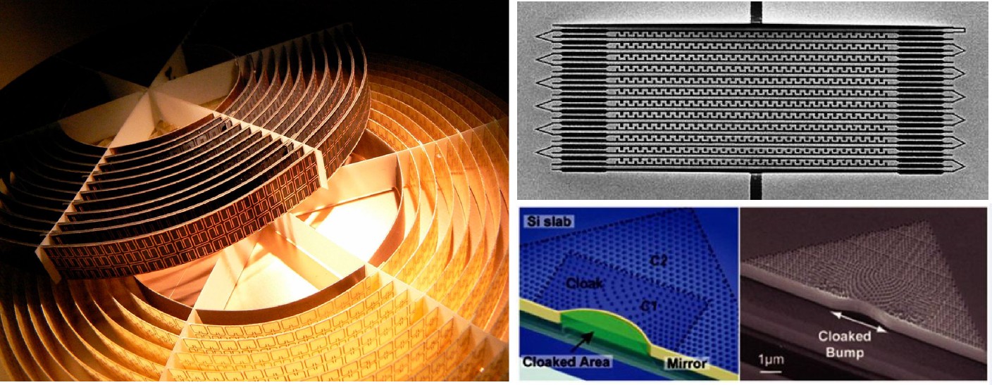 研究方向 人工微结构是一种人工设计的微纳材料,其结构尺寸小于或等于入射波场(如电磁波、声波等)的波长,通常被学术界称为超材料(对于平面型超材料又称为超表面)。与传统体材料不同,人工微结构材料的物理性质并不取决于其组成分子或者原子,而是决定于所设计的“人造原子”,通过任意设计“人造原子”的单元以及排列方式,可以在不违背基本的物理学规律的前提下,获得与自然界中的物质具有迥然不同的超常物理性质的“新物质”,进而发展自然材料难以实现的新奇物理效应——如负折射、光学隐身、异常折射、光子霍尔效应等。迄今发展出的人工微纳结构材料多与光、声、电、磁、热等性质相联系,为人类新材料、新技术的突破提供了一个新契机。同时,人工微纳结构材料也在军事领域具有非常广阔的应用领域,它已被评为美国国防部2013-2017年科技发展“五年计划”中重点关注的六大颠覆性基础研究领域之一,美国国防部先进研究项目局(DARPA)把人工微结构定义为“强力推进增长领域”,美国空军科学研究办公室(AFOSR)将其列入“十大关键领域”;Science杂志也分别在2003年和2006年评选此人工微纳材料为“十大科学进展”。 人工微结构波场调控是指利用人工微纳结构在亚波长尺度对波场的偏振、振幅、相位、频率等性质进行高度定制化的调控,为发现新效应和新现象、开发新器件和开拓新应用提供了重要途径。开展人工微纳结构波场调控研究,不仅有助于深刻理解波场与物质相互作用,而且对其它学科或领域的发展具有重要的推动作用。我们课题组主要针对人工微纳结构材料在光场、声场等波场调控领域的新物理效应、新技术应用进行系统性研究。 ![]() 图1 利用亚波长乃至深亚波长尺度的人工微结构与波场发生明显的相互作用, 1. 人工微结构光场调控实现对光场频率、振幅、相位和偏振态等多个维度的自由操控,进而获得小型化、轻质化和集成化的光学器件是目前国际上微纳光学和信息光学领域的重要研究内容。超表面作为一种人造“光学原子”,为实现对光与物质相互作用的增强和操控提供了一种有效手段,为在微区实现对光场的高效调控提供了一种全新的方式,是新世纪以来微纳光学研究领域中备受关注的前沿方向。利用超表面不仅能够实现对光波频率、振幅和偏振态的灵活操控,同时还能够在亚波长尺度下实现对光场相位的有效控制,因此超表面在光场操控方面具有广泛的应用前景和应用价值,相关研究为微纳光学领域光学器件未来的研究、设计和发展提供了无限的可能性。实现对光场在不同维度下的灵活控制是目前超表面研究领域的热门方向,由此产生的新的光学现象和性能优异的光学器件开始受到人们越来越多的关注。近年来,我们在超表面光场偏振态、相位、振幅和多维度联合调控方面取得了一系列研究进展,揭示了超表面在光场调控研究领域巨大的研究潜力和广阔的应用前景 [Adv. Mater. 31, 1802458 (2019);Adv. Mater. 31, 1805912 (2019)]。例如我们利用人工微结构在亚波长尺度下直接操控光场相位的方式,在非手性微结构中实现了可控旋光,相比于传统的旋光方式,这种非手性微结构可以通过对微结构单元结构参数的有序设计,实现对旋光度大小更加直接、灵活的控制 [Light: Sci. & Appl. 5, e16096 (2016)];我们基于单层交错纳米天线人工微结构阵列,提出了一种具有广泛适用性的超表面二分之一波片设计方法,实现了偏振转换角与波长无关的宽带二分之一波片 [ACS Photonics 4, 2061 (2017)];我们在提出多棒能级杂化及镜像理论的基础上,通过增加微结构单元中金属棒的数量将几何相位的调控效率提高至理论极限,同时有效地扩宽了微结构的响应带宽 [Adv. Funct. Mater. 25, 5428 (2015)];我们提出了一种全新的金属棒微结构设计,通过增加金属棒的厚度产生了新的共振模式,进而在1067 nm波长下实现了对入射光场在金属棒长轴方向上p的相位延迟,并实现了效率高于70%的光子自旋霍尔效应 [Adv. Opt. Mater. 5, 1700413 (2017)];我们通过对亚波长金属天线微结构的结构参数和旋转角度的合理设计,实现了对出射光场相位和振幅的联合调控,进而实现了高质量艾里光束的生成 [Adv. Opt. Mater. 4, 1230 (2016)]。