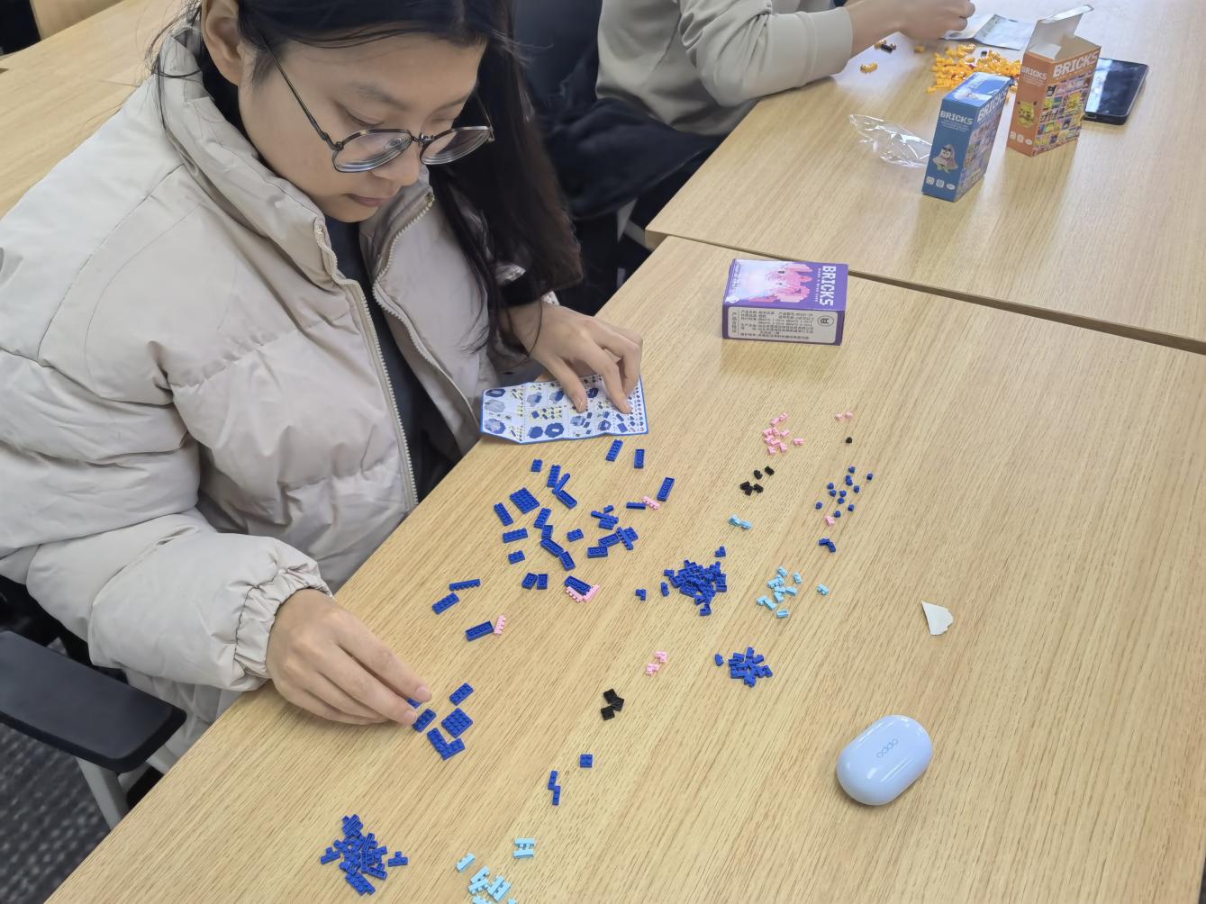 活动中,同学们在党员骨干的指导下,用积木拼接自己喜爱的卡通人物。大家时而低声交流,时而默契拼接,在色彩斑斓的积木块中开启创意之旅,现场播放的减压电影为活动营造了轻松愉快的氛围。同时,教室边近百本心理健康类图书,捏捏乐、涂色本等解压玩具同步供同学们使用,多维度为同学们提供心理舒缓方式。“拼积木时能完全专注当下,完成后特别有成就感,在潜移默化中减轻了压力。”参与活动的同学分享道。